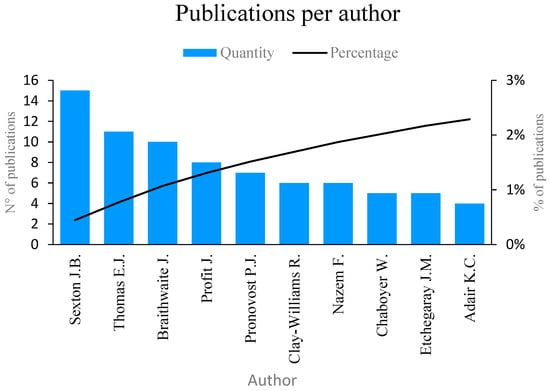 Figure 5 shows the 10 most productive authors. Sexton J.B. has the most publications, with 15, followed by Thomas E.J., with 11 publications, and Braithwaite J., with 10 publications. For the authors ranked fourth to tenth, the number of publications ranges from eight to four publications, respectively. The largest number of publications is not concentrated in a small number of authors but rather distributed among many authors with one to three publications. A decentralization based on three groups can be established: 0.326% account for 2.28% of the articles, corresponding to the 10 most productive authors; 1.37% account for 3.94% of the articles; and 98.30% account for 93.63% of the articles, demonstrating the diversity of authors who are interested in the topic. Notably, the number of publications per author can be analyzed by the importance of the subject, prestigious journals and researchers that promote research; however, for the evaluation of publications, it is necessary to analyze the number of citations, which reflects quality [52].