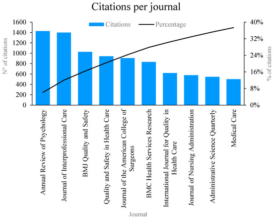 Figure 6 shows the 10 journals with the highest number of citations, accounting for 37.38% of the total. The first three places are led by Annual Review of Psychology (USA), with 1428 citations, followed by Journal of Interprofessional Care (UK), with 1399 citations, and BMJ Quality and Safety (UK), with 1028 citations. A second important group is represented by Quality and Safety in Health Care (UK), with 943 citations, ranking fourth, closely followed by Journal of the American College of Surgeons (USA) and BMC Health Services Research (UK), with 906 and 833 citations, respectively. In the first group, the journal with the highest productivity is from the United States, followed by journals from the United Kingdom. The same occurs in the second group, with the three journals from the two countries. This finding is supported by the results in Figure 4, where it can be seen that the United States and the United Kingdom excel in productivity, both in quality and quantity, in the subject investigated.