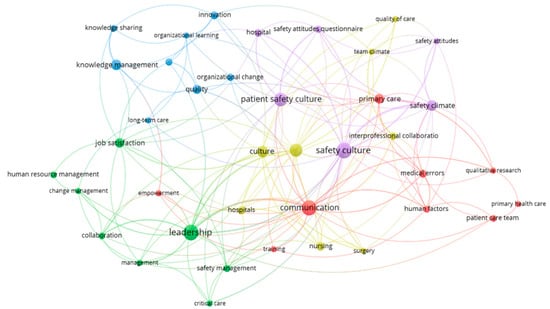 Cluster 2 consists of eight nodes with five direct connections to the nodes of change management, collaboration, management, safety management, and critical care. Job satisfaction and human resource management are indirectly connected. There are direct connections between quality improvement in Cluster 4 and safety culture in Cluster 5 with the main communication node in Cluster 1. In Cluster 3, the main node is directly linked with three nodes: knowledge sharing, innovation and quality. Organizational learning, healthcare and organizational change are indirectly connected with the main nodes of the other clusters. Cluster 4 has eight nodes with five direct connections, i.e., culture, hospital, surgery, team climate and quality of care. Cluster 5 has six nodes, with direct connections to some nodes in Clusters 2, 4 and 5, for example, management, human factor and interprofessional collaboration.