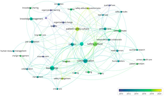 Figure 9 shows the keyword overlay, displaying the links among words in the temporal space in which the research was published. The research trends are shown from 2010 to 2020. In 2019, jobs are within Cluster 3, indicating interest in the term knowledge exchange. Cluster 5 indicates interest regarding culture in patient safety, questionnaires in safety attitudes and safety administration. Likewise, between 2016 and 2018, there was an emphasis on research on organizational culture and teamwork in hospital settings such as nursing and surgery, focusing efforts on the safety climate in intensive care areas.