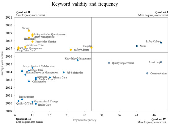 Figure 11 shows the frequency and validity of the keywords based on year. Quadrant I indicates the most frequent and current terms. Among the keywords that stand out are research associated with safety culture and nurses. Such studies propose that the promotion of a culture of patient safety is the best way to overcome challenges in different health areas, including nursing, and that a culture of patient safety should be promoted through the development of policies that regulate the incidence and notification of adverse events, proposing a culture free of guilt [79], as recent studies show that a culture of safety in health units is still incipient [80].