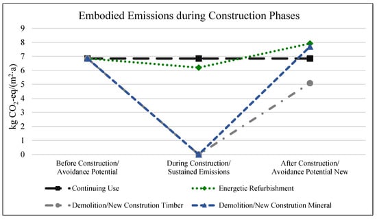 Figure 3 displays the benefits of continuing use of existing structures. The embodied emissions of the building are presented before construction, during construction and after the construction phase for four different scenarios. Here, all emissions from demolition and new buildings C0 and A0 and the future demolition C50 are considered equivalent new buildings, as described in Section 2.1 (AP) previously. Maintenance and replacement are not accounted for. The SE are those that will remain in the building during construction, for instance, in the case of energetic refurbishment. The results are calculated without the biogenic carbon content for all constructions, which is equivalent to GWP fossil according to EN 15804:2022-03 [9]. The continuing use of the building has no influence on the embodied emissions, while the energetic refurbishment parts of the building must be removed and more materials added to the building during the refurbishment measure. For the case of demolition and new construction, the embodied emissions are zero at the point of construction and depending on the use of material, rise again to a certain point after construction.