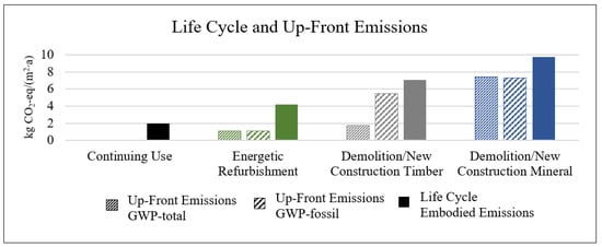 The sum of all material-related emissions is displayed in Figure 5. The new construction in minerals has the highest embodied emissions over the life cycle, followed by timber construction and energetic refurbishment. The embodied emissions of the continuing use are only based on calculations for Modules B2-4 and C50. Due to not regarding the operational energy consumption and the related emissions over the life cycle, the results cannot be interpreted enough for decision making. Also, the upfront emissions as the sum of A0 and C0 for construction are presented. A great share of overall material emissions is caused by the upfront emissions in the case of demolition and new buildings. Further, the biogenic carbon content of the timber construction can shift the results of the upfront emissions in comparison to GWP total and GWP fossil.