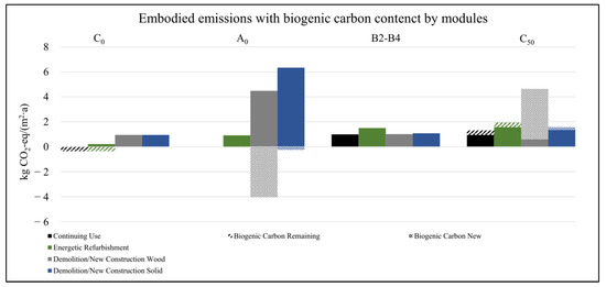 Previously shown results mostly exclude the biogenic carbon content of different variants. Especially regarding the emissions of the demolition and new construction in timber, the biogenic carbon content has a great influence on the results. Thus, Figure 6 shows the influence of the biogenic carbon content on the life cycle modules. In Module C0, the biogenic carbon content of the remaining parts is transferred to the subsequent product system for the case of continuing use and energetic refurbishment [37]. Comparing the biogenic carbon contents, which are transferred to the subsequent product system, the carbon content from the continuing use will always be equal or greater compared to the energetic refurbishment, which is due to products being dismantled for refurbishment measures. For materials that are disposed of during the construction, such as roof components, the biogenic carbon is calculated at −1 and +1 kg CO2-eq./kg CO2 as it enters and leaves the system at the same time and is, therefore, not assessed and displayed [37,39]. For new components, in the cases of energetic refurbishment and the two new construction variants, the biogenic carbon is assessed in Module A0 negatively and in Module C50 positively with the same amount after 50 years. The biogenic carbon content of the new construction in timber is about 4 kg CO2/m2∙a, which is comparatively less than the fossil emissions for construction. The carbon content over the life cycle of the new construction is accounted for zero, but the actual emissions occur delayed over the life cycle, which is relevant for the assessment of GHG emissions on a national level [39]. The amount of biogenic carbon content is much higher for timber constructions in comparison to mineral constructions. For the case of energetic refurbishment, two biogenic carbon contents from the remaining parts of the building and the newly installed parts are calculated in C50. To ensure future comparability in CO2 emissions, it is recommended to use GWP fossil as an indicator.