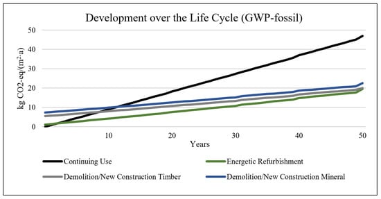 In this section, the previously shown results are extended by adding the operational energy demand and the resulting emissions for the four variants over the estimated life cycle of 50 years, as shown in Figure 7. The x-axis shows the timeline of the life cycle, and the y-axis shows the cumulated fossil emissions of CO2 equivalents. As expected, the energetic performance of the building has a significant influence on the overall results and should always be considered in cases of comparison. The variant of continuing use has the highest life cycle emissions with about 47 kg CO2-eq/m2∙a, including embodied and operational emissions. The lowest total emissions are caused by the energetic refurbishment with about 19.62 kg CO2-eq/m2∙a, followed by the new construction in timber with 19.95 kg CO2-eq/m2∙a. The total emissions of the demolition and new construction in minerals is about 22.6 kg CO2-eq/m2∙a, which is still less than half of the continuing use scenario. Module B6 represents the gradient of the graphs over the entire life cycle, while Modules B2-4 can be noted as small time-concentrated increases in specific years.