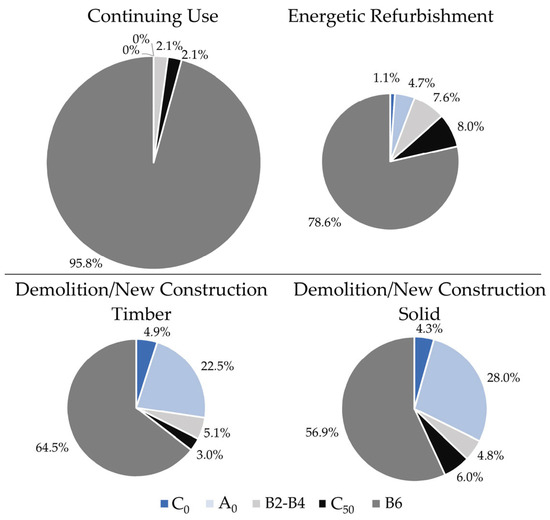 An alternative approach to illustrate the origin of fossil emissions over the life cycle of the four variants is provided in Figure 8. Here, embodied and operational emissions over the life cycle are shown. The diameter of the pie charts mirrors the total emissions over the life cycle and leads to varying sizes of the corresponding charts. Almost all emissions of continuing use occur in Module B6 with 96% of emissions. The energetic refurbishment Module B6 accounts for 79% of the emissions and Modules B2-4 as well as C50 contribute about 8% of the total emissions. Since approximately 90% of material potentials have been saved in the building, the share of operational energy emissions increases. With demolition and new construction, the share of operational emissions decreases to 64% for timber construction and 57% for mineral construction. Meanwhile, the material further affects the overall results. The demolition of the existing building in Module C0 accounts for between 4% and 5% of the results, whereas the new construction in Module A0 is responsible for 22% of the emissions for timber construction and 28% for mineral construction. Modules B2-4 of the new buildings have a share of 5%, and the deconstruction of the entire building after 50 years (C50) ranges between 3% for timber construction and 6% for mineral construction.