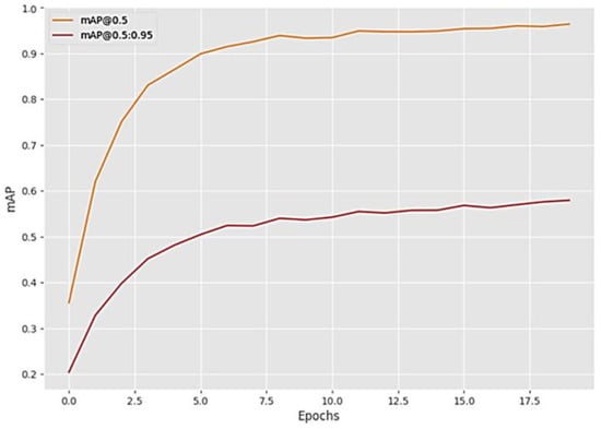 The final developed PPE-detection model has been discussed in this section. To evaluate the model, Precision, Recall, and mAP metrics are applied and most widely used in the literature for similar studies [50,51,52]. The selection of these metrics is based on the literature review since these were the most used metrics. Precision refers to the number of detected objects that are true, while recall refers to the number of correct objects detected [49]. Accordingly, the mAP score is determined based on the Area Under Curve (AUC) that is defined as the Precision and Recall curve. Further, mAP50 will be used to calculate intersection over union (IoU) overlaps when they exceed 50% of the true bounding box [49]. Table 4 compares the proposed Faster RCNN model with the YOLOv5 model that was trained on a common dataset. Similarly, both models were trained using the same hyperparameters and dataset classes. However, YOLOv5’s model scored 63.9% for the mAP50, 22.4% lower than Faster RCNN’s. As the Precision score was higher in the Faster RCNN model, it was chosen for the study, while YOLOv5 was the runner up in this contest.