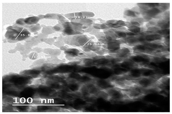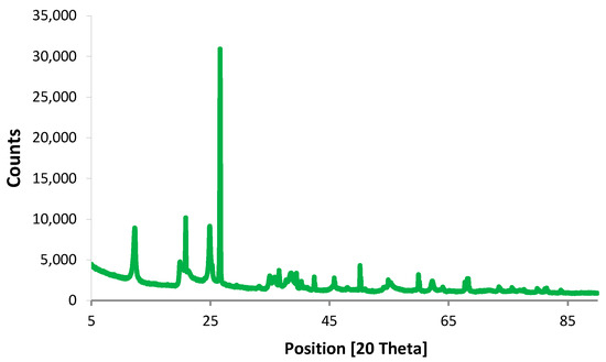 The SEM utilizes Cu-K radiation with a 2-scan range of 5.005–8.99757° to capture the particle size and surface morphology. As shown in Figure 3, the SEM scanning for nano clay reveals that the particles diameter generally varies from 15 to 40 nm. The XRD test exposes the tested material to X-rays, which are diffracted by hitting the composing crystals. Each mineral component has its unique crystal composition. Thus, the diffraction angle of X-rays can reveal the mineral composition of the material. The XRD pattern of the nano clay, shown in Figure 4, shows multiple peaks corresponding to different diffraction angles, where the highest peak is ascribed to the Al2Si2O5(OH)4. Table 3 also presents the other physical properties of nano clay.