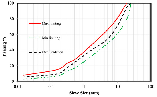 The aggregates used for the asphalt mixture were a coarse aggregate of crushed dolomite, a fine aggregate of siliceous sand, and a mineral filler of limestone dust. The aggregates were sourced from the local contractors of Sohag City in Egypt, where the mountains and desert surrounding the city are the main source for the aggregate used in the construction in the city. The three aggregate types were mixed together to form a combined aggregate which fulfils the gradation of dense graded wearing course (4C) specified in the Egyptian standard specifications [40]. Figure 5 shows the gradation of the combined aggregate as well as the lower and upper limits according to the Egyptian specifications for the aggregate gradation of the surface asphalt layer. The basic properties of the aggregate are shown in Table 4. The optimum bitumen content (OBC) was estimated according to the Marshall-Mix-design approach [41]. The bitumen content, which achieves an air void ratio of 4%, was found to be 5%. As shown in Table 5, the volumetric characteristics and load stability of the asphalt mixture at this bitumen content fulfil the specifications. Therefore, the OBC was decided to be 5% for all kinds of asphalt binders.