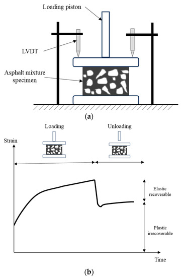 Static creep test for asphalt mixture. (a) Sample loading; (b) Strain provoked in the sample during the loading and unloading stages.
