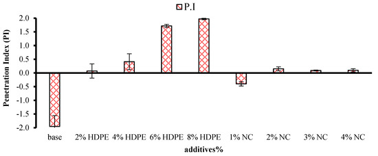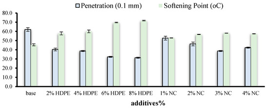 Figure 7, Figure 8 and Figure 9 elaborate on the penetration, softening point, penetration index, and viscosity of the virgin and modified asphalt binders. The results reveal a great impact for both modifiers on the binder consistency and flow. Generally, the modified binders have lower penetration, higher softening point, lower penetration index, and higher viscosity than the base binder. Accordingly, it can be concluded that the HDPE and NC significantly escalate the binder stiffness. However, by increasing the modifier dosage, it is possible to further reduce the penetration depth and increase the RVs and PI values. This shows an improvement in the heat stiffness and sensitivity of the binder, leading to stronger resistance to permanent deformation at higher temperatures. However, under extreme dosages of 6% and 8% high-density polyethylene, the viscosity increases to 4991 MPa and 9647 mPa.s, respectively, and does not meet the workability criterion for the asphalt mixture (3000 mPa.s). Moreover, the results also show that the HDPE asphalt binders have lower penetration and a higher softening point than NC binders.