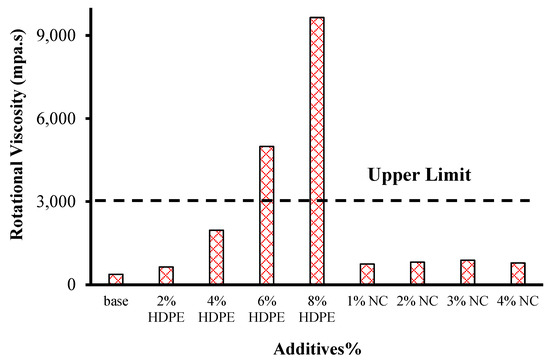 Both the high-density polyethylene and nano clay were mixed with the asphalt binder for 60 min utilizing a shear blender of 4000 rpm to produce polyethylene-modified binder (HDPE) and nano clay-modified binder (NC). Based on the recommendations of previous studies [25,38,39], the mixing temperatures were selected to be 180 °C and 145 °C for the production of HDPE and NC, respectively.