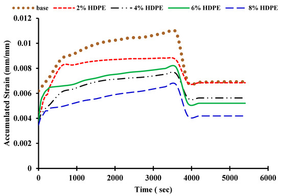 The accumulated axial strain with time for high-density polyethylene-modified mixtures.
