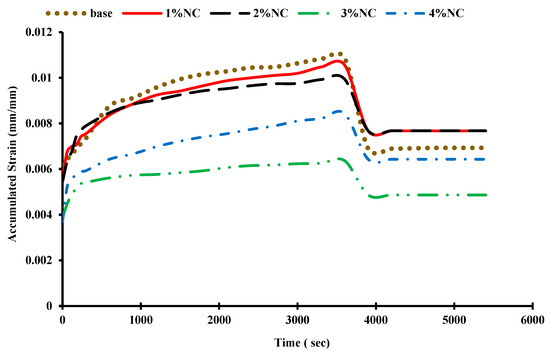 The accumulated axial strain with time for nano clay-modified mixtures.