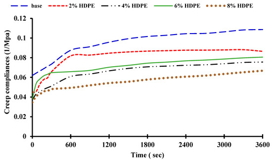 Creep compliances with time for high-density polyethylene-modified mixtures.