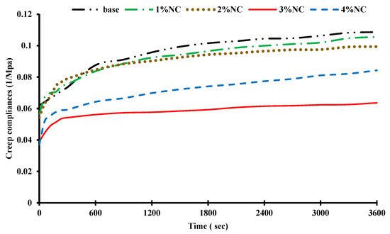 Moreover, since Smax examines the resistance to deflections, a larger number denotes stronger rutting resistance. As observed in Table 6, a mixture of 8% high HDPE and that of 3% NC have the highest Smax and the highest rutting resistance. The stiffness of the modified asphalt mixtures was enhanced by 71% and 62% at the additive ratios of 3% and 8% for NC and HDPE, respectively. The base mixture, on the other hand, exhibited the highest rutting tendency due to its lowest Smax. The viscoelastic behaviour of the asphalt mixtures was characterized by the creep compliance factors. The creep compliance with time during the loading stages for the asphalt mixtures is presented in Figure 12 and Figure 13. Higher creep compliance values indicate a higher potential for rutting. Among the modified mixes, 3% nano clay and 8% high-density polyethylene showed the lowest creep compliance-time trend values as well as the lowest tendency to rut.