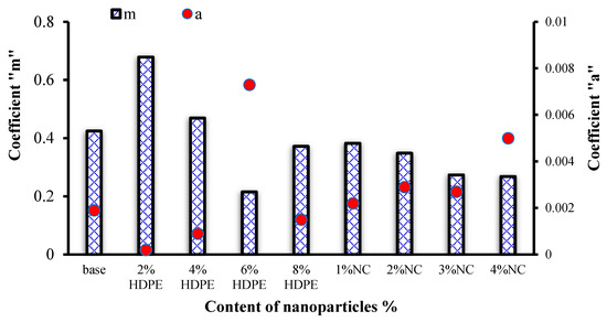In addition, creep compliance criteria were computed utilizing the power low depicted in Equation (5). As shown in Figure 14, the creep compliance factors (a and m) for each asphalt mixture reveal that NC and HDPE modifications have a noticeable effect on creep compliance characteristics. The parameter a indicates the initial deformation provoked during the loading, while the m parameter denotes the increasing trend of creep compliance with time. Therefore, the lower the a and m values, the lower the creep compliance of the asphalt mixture. The results reveal that, except for asphalt mixtures of 2% HDPE and 4% HDPE, the asphalt mixtures of modified binders have a lower m value than the mixture of virgin binder, ensuring the potential of HDPE and NC modifications to undermine the creep compliance of asphalt mixture. Although the mixtures of 2% HDPE and 4% HDPE have relatively high m values, their values are significantly low, indicating low compliance for a creep at the beginning of the load.