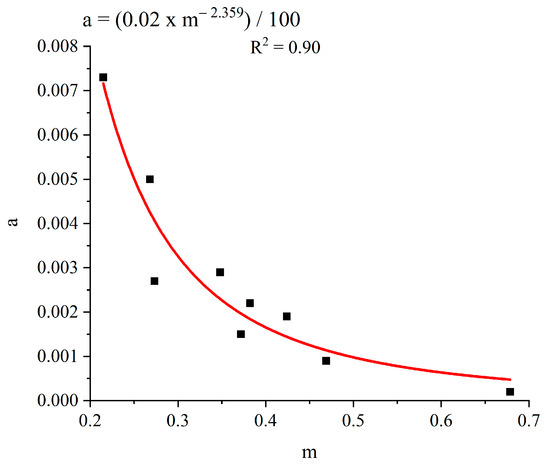 The correlation analysis proves a strong correlation between the a and m values of the asphalt mixture. As shown in Figure 15, the higher the value, the lower the m value. In other words, the asphalt mixture of high deformation at the beginning of the loading has a low creep increment with time during the loading stage. This behavior is due to the microstructure characteristics and voids distribution inside the asphalt mixture. The asphalt mixtures of low m value may have a relatively low air void and a homogenous structure, which leads to a gradual increment in the strain by loading instead of a sudden initial high strain. As the modified asphalt mixtures have significantly different a and m values than the mixture of virgin binder, it can be claimed that the different consistency of modified binders affects the microstructure of the asphalt mixture, leading to a different creep behavior. Moreover, as most NC asphalt mixtures have a lower m value than that of virgin binder, it can be said that the binder modification with NC can greatly improve the homogeneity of the asphalt mixture.