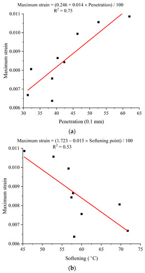 Impact of binder stiffness on the maximum strain provoked in the asphalt mixture under axial loading. (a) Correlation between maximum strain and penetration value of the asphalt binder; (b) Correlation between maximum strain and softening temperature of the asphalt binder. Note: the correlations are significant according to both statistical tests, t-test and f-test (p value < 0.05).
