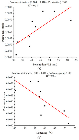 The impact of binder stiffness on the permanent strain remains in the asphalt mixture after the relaxation period. (a) Correlation between permanent strain and penetration value of the asphalt binder; (b) Correlation between permanent strain and softening temperature of the asphalt binder. Note: the correlations are significant according to both statistical tests, t-test and f-test (p value < 0.05).