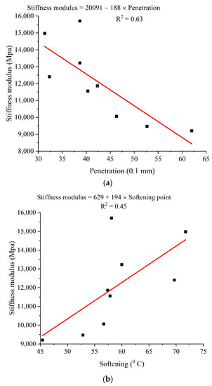 Impact of binder stiffness on the stiffness modulus of the asphalt mixture. (a) Correlation between stiffness modulus of asphalt mixture and penetration of the asphalt binder; (b) Correlation between stiffness modulus of asphalt mixture and softening temperature of the asphalt binder. Note: the correlations are significant according to both statistical tests, t-test and f-test (p value < 0.05).