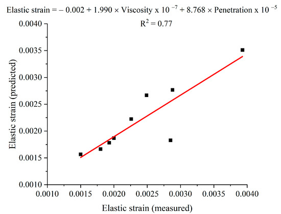 The impact of binder consistency and flow on the creep characteristics of asphalt mixture was investigated through the correlation analysis between penetration, softening point, viscosity, and different parameters of creep characteristics. The correlation coefficient (R2) was pursued, while the statistical tests, t-test and f-test, were conducted to check the significance of each predictor and the entire regression model. As shown in Figure 16 and Figure 17, the maximum strain at the end of the loading period and permanent strain at the end of the unloading period are highly correlated to the binder stiffness. Both strains significantly decrease by the reduction of the penetration value and increment of softening point. The high stiffness of the asphalt binder, materialized in low penetration and a high softening point, greatly undermines the strains of the asphalt mixture. Moreover, as shown in Figure 18, the stiffness modulus of the asphalt mixture significantly increases by lowering the binder penetration and escalating the softening point. As the high stiffness of the asphalt mixture implies a low capability for creep and deformation under loading, it can be claimed that the higher the binder stiffness, the higher the asphalt mixture’s potential to resist creep and deformation under axial loading. Generally, the correlation analysis confirms the crucial role of binder stiffness in the creep characteristics of the asphalt mixture.