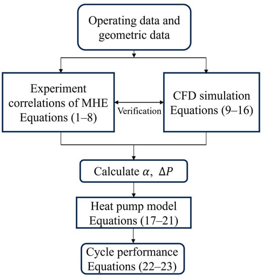 The flowchart of this work is presented in Figure 1 to express the relationship between the established models. Based on the operating and geometric data, the heat transfer coefficient and pressure drop can be estimated based on the MHE model (Equations (1)–(8)) and CFD simulation (Equations (9)–(16)). The results between the two models are in good agreement, and the CFD simulation can help us understand the effect of frost formation on cycle performance in terms of heat transfer and flow resistance. By combining the MHE model, CFD simulation, and heat pump model (Equations (17)–(23)), a multi-scale mathematical model is developed to investigate the cycle performance and single-charge driving distance. The effects of frosting formation, as well as operating conditions, geometry parameters, and other factors, on cycle performance can also be predicted.