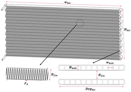 The geometric structure and parameters of the studied microchannel heat exchanger are presented in Figure 2 and Table 1, respectively. Based on these parameters, the heat transfer coefficients and pressure drop can be estimated using the following equations.