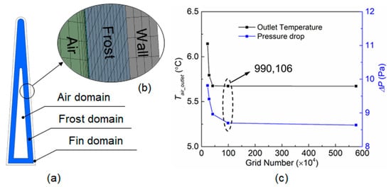 In this CFD simulation, the computational domains include the air domain, frost domain, and fin domain, as shown in Figure 3a. In an effort to balance efficiency with accuracy in calculations, simulations are conducted using four distinct grid groups, comprising 226,570, 283,946, 415,650, 990,106, and 5,766,436 meshes, respectively. The detailed boundary conditions are as follows: