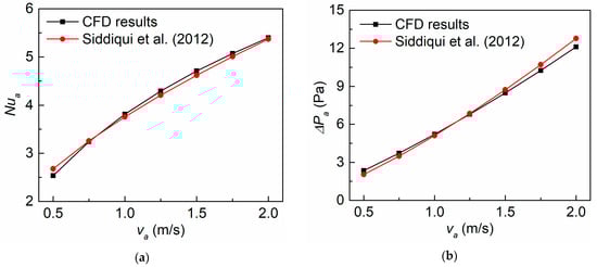 To validate the developed CFD model, the simulation results are compared with the data published in [31]. In that study, the air-side heat transfer and flow performances of a multi-port serpentine cross-flow microchannel heat exchanger were investigated experimentally, and the airflow and heat transfer correlations were derived. It can be seen from Figure 4 that the Nusselt number and pressure drop predicted by the CFD model are in good agreement with the experimental data.
