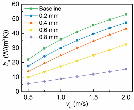 Figure 5 depicts the effect of the frost layer thickness on the heat transfer coefficient under different air velocities, and the corresponding Reynold number is between 11.6 and 306.7. In this work, the microchannel heat exchanger without frost growth is considered as a baseline. It can be found that the heat transfer coefficient increases with the increase in air velocity with a power-law relationship, which agrees with the experimental data [31]. For a given air velocity, the heat transfer coefficient decreases as the frost layer thickness increases. The decrease can be attributed to the thermal resistance caused by frost growth. Increasing air velocity improves the heat transfer coefficient, which can relieve the effect of frost growth on heat transfer. Meanwhile, frost growth also decreases the effective heat transfer area, resulting in poor heat transfer performance.