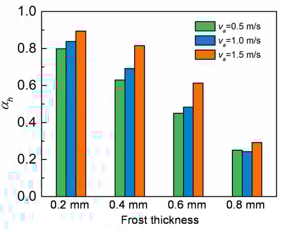 To further understand the effect of frost growth on the air-side heat transfer, a quantitative index (αh) is proposed. The αh represents the ratio between the heat transfer coefficient of the frosted case and that of the baseline (without frost). The frost layer thickness significantly affects the heat transfer characteristics, as shown in Figure 6. The heat transfer coefficient is reduced by about 75% when the frost layer thickness is 0.8 mm. Meanwhile, it can be found from Figure 6 that the effect of the frost growth on the heat transfer coefficient is more significant at a lower velocity.