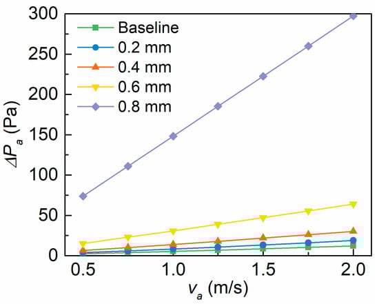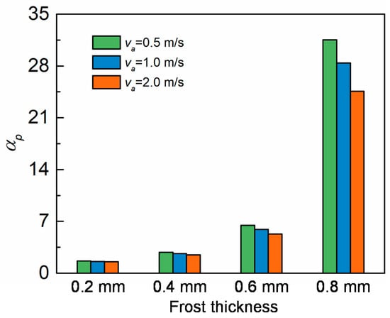 Figure 9 illustrates the effect of the frost layer thickness on the air-side pressure drop. For a given air-side inlet velocity of 1.0 m/s, the pressure drop is increased from 1.6 times to 28.4 times with the frost layer thickness increasing from 0.2 mm to 0.8 mm, compared to the baseline. Meanwhile, the αp decreases as the air-side inlet velocity increases, especially in the case of a thicker frost layer.