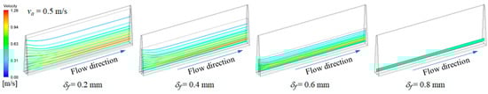 Figure 7 shows the effect of frost layer thickness on the air-side pressure drop between the air-side inlet and the air-side outlet. The air-side pressure drop increases with increasing air velocity in a linear manner, which is consistent with the laminar principle. At an inlet air-side velocity of 1.5 m/s, the flow resistance at the frost thicknesses of 0.4 mm is 90.1% lower than that at the frost thicknesses of 0.8 mm. Meanwhile, variations in air-side streamlines at a given inlet velocity of 0.5 m/s are depicted in Figure 8. The air-side pressure drop increases with increasing air velocity in a linear manner, which is consistent with the laminar principle. Meanwhile, as the frost layer thickness increases from 0.2 mm to 0.8 mm, the air-side cross-sectional area decreases and the pressure drop gradually increases. This phenomenon can be explained by the fact that the flow area presents an exponential downtrend as the frost thickness rises. At frost thicknesses of 0.2 mm and 0.4 mm, the flow areas of one fin channel exhibit values of 9.24 mm2 and 4.78 mm2, but those values descend to 0.18 mm2 when the frost thickness reaches 0.8 mm. A very small flow area seriously strengthens the flow resistance, thus causing a sudden increase in pressure drop.