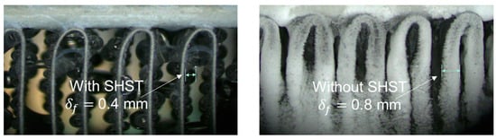 The frost thickness of microchannel heat exchangers with and without SHST at an operating time of 30 min.