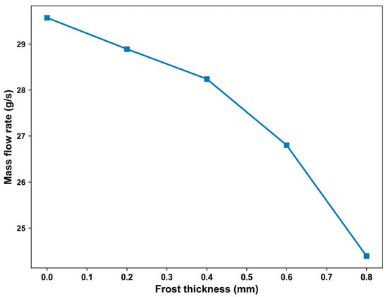 Figure 12 illustrates the refrigerant mass flow rate with varying frost thicknesses. A gradual decrease is initially observable in the refrigerant mass flow rate as frost thickness augments, followed by a steep decline. This trend is primarily due to the reduction in the air-side heat transfer rate and an escalation in flow resistance as frost thickness rises, adversely affecting the heat transfer efficiency of the evaporator and diminishing the refrigerant mass flow rate. The degradation of the heat transfer coefficient becomes pronounced when the frost thickness surpasses 0.4 mm, resulting in a sharp decrease in the refrigerant mass flow rate.