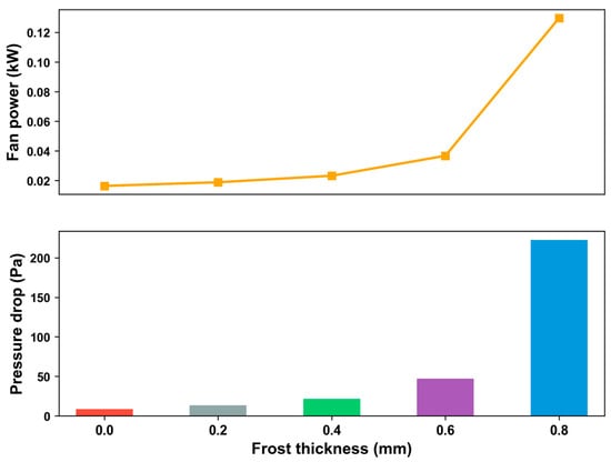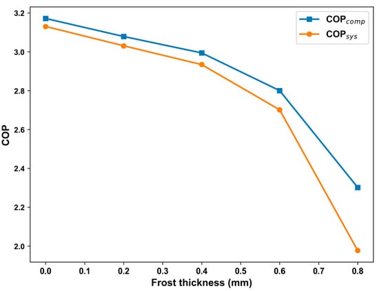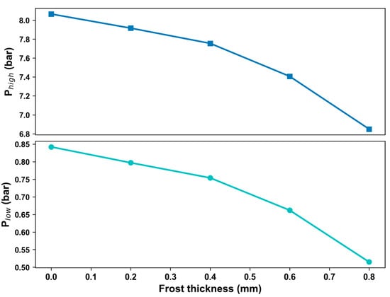 Figure 13 demonstrates the changes in the high-side pressure and low-side pressure of the heat pump system in response to variations in frost thickness. An increase in frost thickness results in a decrease in both high-side and low-side pressures, attributable to the reduced heat transfer coefficient, which consequently leads to a decrease in evaporator temperature and, thus, a reduced low-side pressure. The refrigerant temperature at the compressor outlet also drops due to a lower inlet temperature, causing a decrease in the condenser temperature and, hence, a lower high-side pressure. Thus, frost accumulation induces a drop in heat transfer efficiency, resulting in a lower refrigerant mass flow rate and operating pressures.