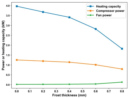 In cold operating conditions, frost accumulation can markedly curtail the heating capacity, thereby significantly decreasing the COP. This section explores the impact of frost thickness on heating capacity, compressor power, fan power, operating pressure, refrigerant flow rate, and COP. The operating parameters for heating are listed in Table 3.