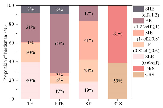 TE is a comprehensive evaluation index of the allocation ability and utilization efficiency of herding households’ livelihood resources. TE was the lowest among the three efficiency values, with an average value of 0.762. Among them, the proportion of SLE and HE herders is relatively large, accounting for 40% and 31% of all herders, respectively. The proportion of LE and SHE pastoral households is second, accounting for 20% and 8% of all pastoral households, respectively. And the proportion of ME pastoral households is relatively small, accounting for 1% of all pastoral households. The SHE and HE pastoralists account for 39% of all pastoralists, indicating that more than one-third of pastoralists in a typical steppe of Inner Mongolia have achieved comprehensive input–output efficiency, and a small number of pastoralists have achieved ultra-high input–output efficiency. The LE and SLE herders accounted for 60% of all herders, indicating that the allocation of livelihood resources of more than half of the herders did not reach the optimal state, and the livelihood efficiency of two-thirds of the herders did not reach 0.6. Therefore, these herders still have room for improvement in the utilization and management of livelihood capital.