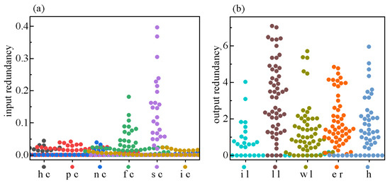 (a) Slack of input redundancy of herders; (b) slack of output redundancy of herders. Note: h c = human capital; p c = physical capital; n c = natural capital; f c = financial capital; s c = social capital; i c = information capital; i l = income level; l l = living level; w l = welfare level; e r = entertainment richness; h = happiness.