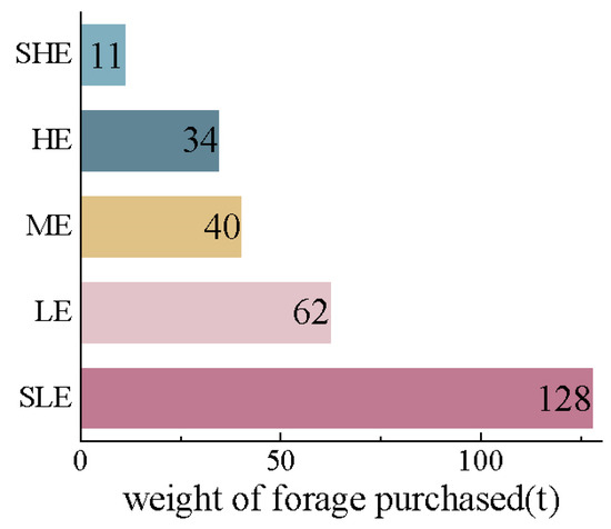 Affected by the increasing degradation of grassland and the grassland subsidy policy, the traditional extensive grazing mode has been changed to the semi-free and semi-enclosed farming mode in Inner Mongolia, and most of the grazing households need to buy forage to a greater or lesser extent. The large purchase of forage by herders helps to regulate the balance of forage and livestock and relieve the pressure of grassland degradation. The weight of forage purchased by herders in the study area is shown in Figure 4. Dong et al. (2023) believe that buying forage is an effective strategy for herders to adapt to extreme drought, which is conducive to improving the technical efficiency of livestock production of herders [45]. The study also showed that herders with lower livelihood efficiency had stronger awareness of ecological protection, larger pasture area, and fewer livestock, and purchased a large amount of forage to relieve the pressure of pastures; Lise et al. (2006) found that richer herding families were more concerned about environmental conditions than poor herding families [46]. Herders mainly rely on grassland resources to survive (Conte, 2015) [47], and grassland degradation will inevitably affect their sustainable livelihoods. Tiwari et al.’s (2020) study in mountainous areas of Nepal also believes that grassland degradation is one of the main factors aggravating the livelihood vulnerability of herders in mountainous areas of Nepal [48]. Only by improving the ecological protection consciousness of herders and coordinating the relationship between grassland ecology and herders’ livelihoods can one obtain better development.