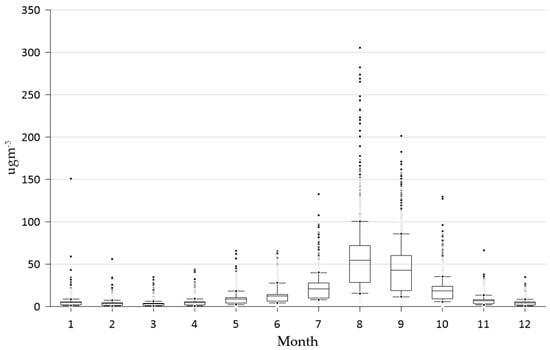 Box plot of the monthly concentration of PM2.5 from April 2020 to October 2022 in Porto Velho. The horizontal line in a box is the mean value. The lower and upper whiskers represent 10% and 90%, respectively.