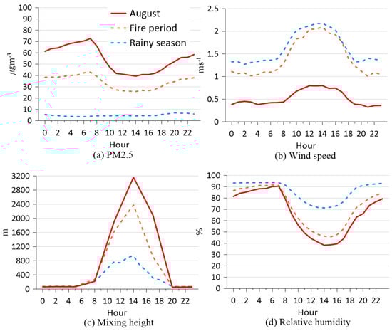 During the day, increased wildfire activity can elevate PM2.5 concentrations [,]. This can intensify PM2.5 concentrations in downwind areas, especially in the afternoon when wind speed drops and mixing height decreases [,]. These patterns are pronounced in diurnal variations, particularly during wildfire seasons and in August. Despite the increased mixing height in August, the PM2.5 concentrations peaked due to frequent wildfires and a 67% decrease in wind speed compared to those of the rainy season, hindering PM2.5 dispersion.