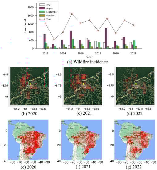 The Amazon rainforest plays a pivotal role as a carbon sink, absorbing greenhouse gases and thereby regulating climate change [,]. However, intentional wildfires are set in the Amazon during the dry season to clear land for pasture and agriculture [,]. These wildfires are significant carbon emission sources, producing carbon aerosols that amplify the impacts of climate change [,,]. Exacerbated climate change conditions, characterized by more frequent droughts and longer dry seasons, further amplify wildfire occurrences [].