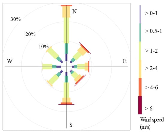 Wildfires that frequently occur within a 30 km radius of the measurement station can impact the PM2.5 concentration levels at the station, contingent on the wind direction and speed. During the period of wildfire occurrences, the wind direction in the Porto Velho region was most frequently northerly and southerly, accounting for 28.4% and 16.4% of the time, respectively (Figure 4). In westerly, southwesterly, and northwesterly winds, light winds of 0–2 ms−1 occurred at an average rate of 95.5%, while relatively strong winds exceeding 4 ms−1 were infrequent, averaging just 0.2%. In contrast, easterly, southeasterly, and northeasterly winds had a comparatively higher percentage of winds exceeding 4 ms−1, averaging 9.2%, while light winds made up an average of 67.4%. Northerly and southerly winds predominantly had light winds of 0–2 ms−1, occurring 77.5% and 78.7% of the time, respectively, with relatively strong winds of 4 m/s or more occurring 2.5% and 6.1% of the time.