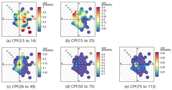 Results of conditional probability function based on PM2.5 (µg m−3) concentration distribution. High CPF values are indicated in red, while low values are shown in blue.