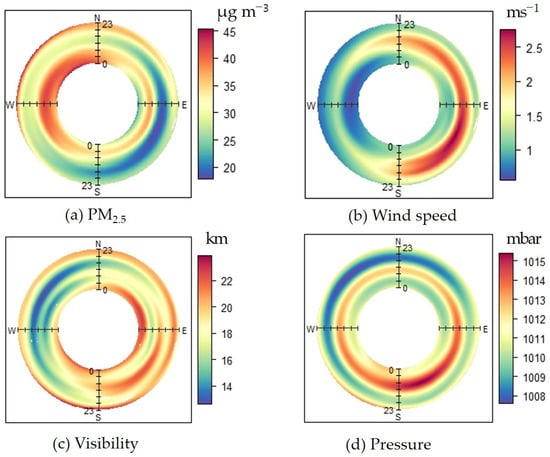 The CPF analysis demonstrated that the distribution of PM2.5 concentrations varies based on the characteristics of wind direction and speed. The polar annulus approach is used to analyze how PM2.5 concentrations change over time based on the wind direction (Figure 6). In the Porto Velho region, higher concentrations of PM2.5 were observed from nighttime to morning in the northerly wind sector and from dawn to daytime over an extended period in the westerly wind sector (Figure 6a). In the easterly wind, high concentrations of PM2.5 were distributed from late dawn to morning. In the Porto Velho region, daytime PM2.5 concentrations are comparatively lower, largely driven by the strong easterly wind influx. Conversely, the elevated PM2.5 concentrations observed in the westerly wind patterns can be attributed to the prevailing weaker wind velocities (Figure 6b). Visibility is a good indicator of air quality, including pollutants such as PM2.5 []. In this region, the visibility was excellent when the southeasterly wind system, which has high wind speed and low PM2.5 concentration, was introduced (Figure 6c). Furthermore, atmospheric pressure was observed to be relatively higher in the southerly wind and lower with northerly and westerly winds (Figure 6d). Such observations imply that wildfires may occur more frequently in the north and west than in the southern regions.