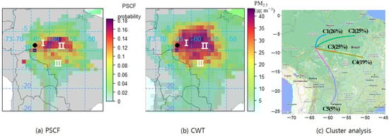 Trajectory source contribution with PSCF, CWT, and cluster analyses (Black circle: Porto Velho, I: state of Amazonas, II: state of Pará, III: state of Mato Grosso).
