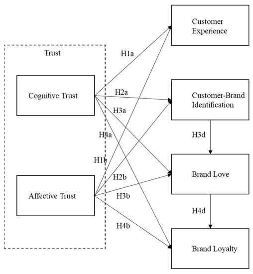 Substantial studies support the positive relationship between trust and brand love [67,68,69]. In the field of hospitality, Song et al. stated that brand love positively affects brand loyalty when they examined the brand–customer relationship of name-brand coffee shops [70]. Customers may love a specific brand based on their past experiences or special emotional bonds, thereby both cognitive trust and affective trust contribute to the development of brand love. However, brand love is considered a significant emotional result of a consumer’s long-term relationship with the brand [32]. Therefore, compared to cognitive trust, we assumed that affective trust has a closer relationship with brand love. The hypotheses were built: