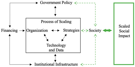 Han and Shah [15] showed that an organization should rely on and leverage both organizational-level and systemic-level factors, and their inter-relationships, to the SSI instead of focusing only on organizational growth as a means to achieve the SSI. These factors included the process of scaling (the organization, strategies, technology, and data), financing, government policy, and institutional infrastructure. Although the SSI’s definition included society as the place where SI takes place [47], the current literature did not explore society (encompassing communities and individuals) as a potential partner and collaborator in this ecosystem.